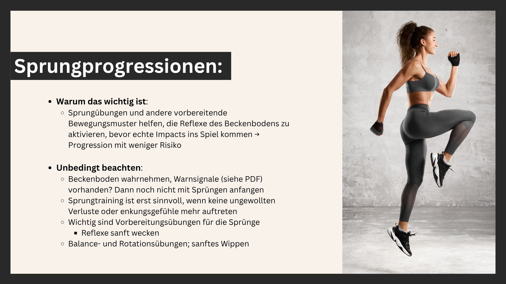 Im letzten Modul lernst du, wie du deine Kundinnen/ Patientinnen wieder belastbar genug für ihren Sport bekommst. Im Detail sprechen wir darüber, wie Progressionen für das Laufen, für Sprünge und Kraftsport aussieht. Du lernst auch, warum Druckmanagement enorm wichtig ist und welche Hilfsmittel (z.B. Pessare) für das Training des Beckenbodens geeignet sind.